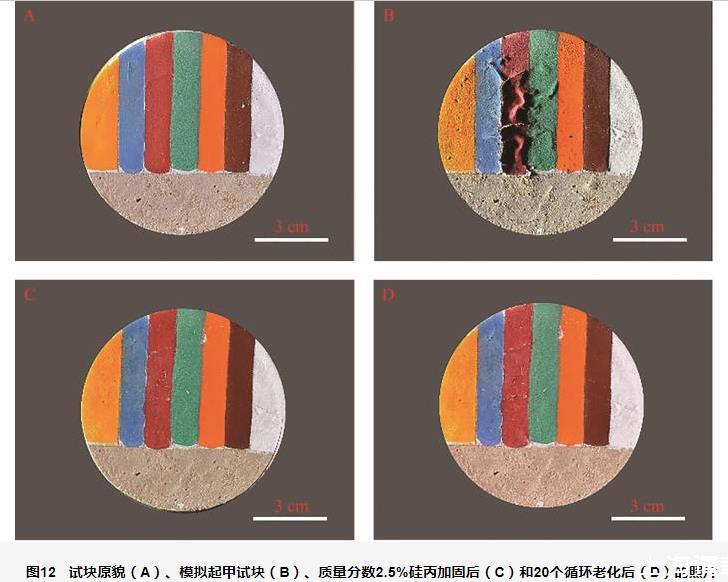 圖12試塊原貌(A)、模擬起甲試塊(B)、質量分數2.5%硅丙加固后(C)和20個循環老化后(D)的照片