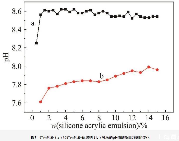 圖7硅丙乳液(a)和硅丙乳液-硫酸鈉(b)乳液的pH值隨質量分數的變化