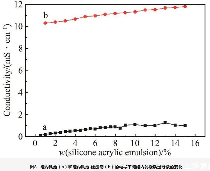 圖8硅丙乳液(a)和硅丙乳液-硫酸鈉(b)的電導率隨硅丙乳液質量分數的變化