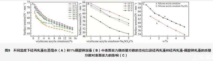 圖9不同溫度下硅丙乳液在蒸餾水(A)和1%硫酸鈉溶液(B)中表面張力隨質量分數的變化以及硅丙乳液和硅丙乳液-硫酸鈉乳液的質量分數對表面張力的影響(C)