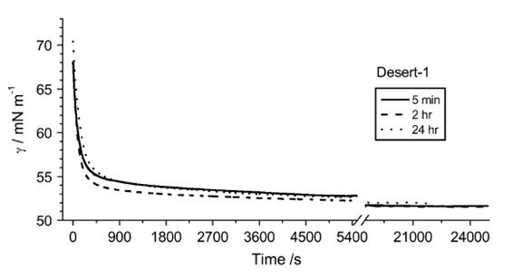 應(yīng)用EZ-PIplus表面張力儀">表面張力儀測試不同時間浸潤土壤后得到的土壤浸潤液的動態(tài)表面張力。