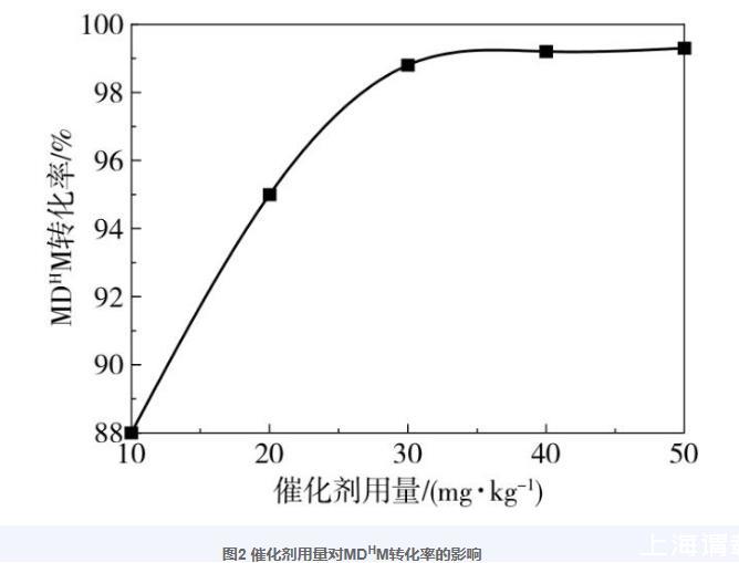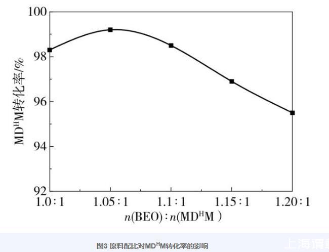在n(BEO)∶n(MDHM)為1.05∶1、三氯化釕催化劑的用量為30 mg/kg、反應時間6.0 h的條件下,考察反應溫度對MDHM轉化率的影響,結果如圖4所示??梢钥闯?,MDHM轉化率隨溫度的升高而增大,這主要是因為Si—H鍵的反應活度受溫度影響,溫度越高越有利于其斷裂。溫度為100℃的MDHM轉化率(99.05%)相較90℃的MDHM轉化率(98.6%)僅提高了0.45%,提升幅度很小,這是因為反應溫度過高會使催化劑的催化效率降低,產物顏色加深,但考慮到MDHM轉化率須大于等于99%,因此本文確定適宜的反應溫度為100℃。