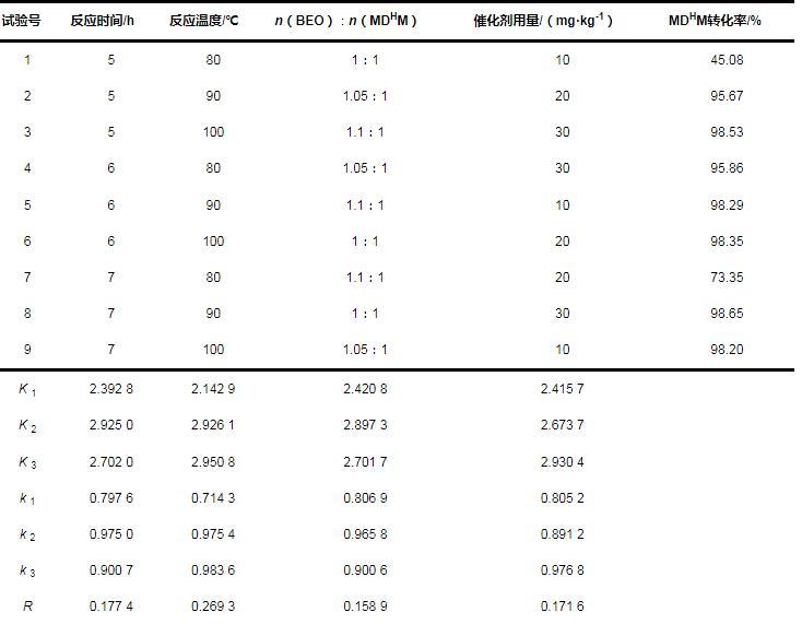 (1)以三氯化釕為催化劑,BEO和MDHM為原料,成功合成了目標產(chǎn)物BEOTSS;采用正交試驗優(yōu)化了催化反應(yīng)條件:催化劑用量30 mg/kg,n(BEO)∶n(MDHM)為1.05∶1,反應(yīng)時間6.0 h,反應(yīng)溫度100℃,在此工藝條件下MDHM轉(zhuǎn)化率可達99%。