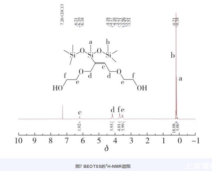 圖7為BEOTSS的1H-NMR譜圖。根據(jù)譜圖中的化學(xué)位移及積分數(shù)據(jù)確定化合物中各基團的氫歸屬,得到以下結(jié)果:1H-NMR(400 MHz,CDCl3),δ=6.24~6.16(m,—C=CH—,1H),4.17(m,—CH 2CCHCH 2—,4H),3.72(d,J=5.6 Hz,—CH 2—OH,4H),3.54(t,J=14.6 Hz,—O—CH 2—,4H),0.21(s,—Si(CH 3)3,18H),0.18(s,—SiCH 3,3H)。由于使用氘代氯仿作為溶劑,產(chǎn)物中的2個—OH為活潑氫,在譜圖中沒有出峰,同時結(jié)合紅外譜圖分析,進一步證明本研究成功合成了目標化合物BEOTSS。