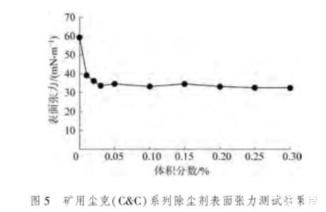 為了確定合理的表面活性劑添加濃度,分別選取了體積分數(shù)為0.01%,0.02%,0.03%,0.05%,0.1%,0.15%,0.2%,0.25%,0.3%的礦用塵克(C&C)系列除塵劑進行溶液表面張力測試,溶劑選用礦井水,測試儀器選用芬蘭Kibron EZ-Pi Plus便攜式動態(tài)表面張力儀,采用最大拉力法記錄圓環(huán)薄膜的拉伸破壞情況,從而計算出液體的表面張力。液滴表面張力越小,其與粉塵接觸后,更容易黏結(jié)沉降。測試結(jié)果如圖5所示。