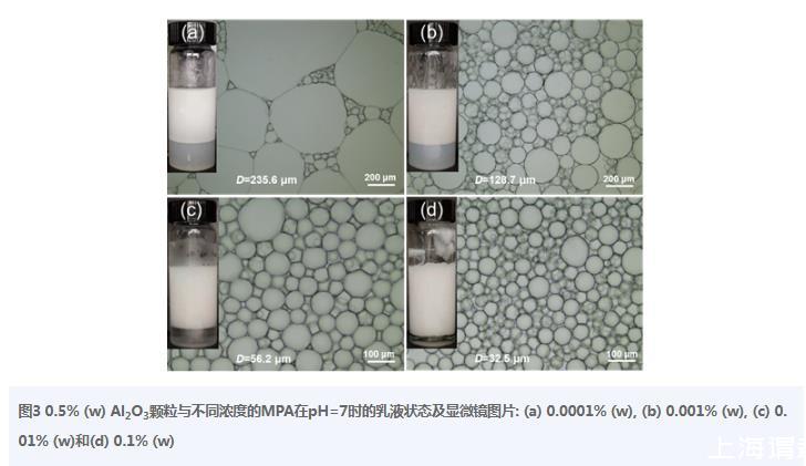體系成份的濃度對乳液的外觀及粒徑有很大影響。圖3為固定0.5%(w)Al2O3顆粒濃度不變,研究在pH=7時不同MPA濃度對Pickering乳液的影響。隨著MPA濃度的不斷增加【0.0001%——0.1%(w)】,乳液下層析出的水相逐漸變澄清,說明MPA濃度增加,更多的Al2O3顆粒與MPA分子發生靜電相互作用,修飾后的Al2O3顆粒更容易從水相層中轉移到乳化層中,吸附在油水界面處,并且乳化層的高度也隨著MPA濃度的增加而升高,也說明更多的活性Al2O3顆粒參與乳化。乳液液滴粒徑隨濃度增加逐漸減小,從235.6μm降低到32.5μm,這是因為油水界面處的活性Al2O3顆粒的量逐漸增多,可以穩定更多的Pickering乳液液滴。