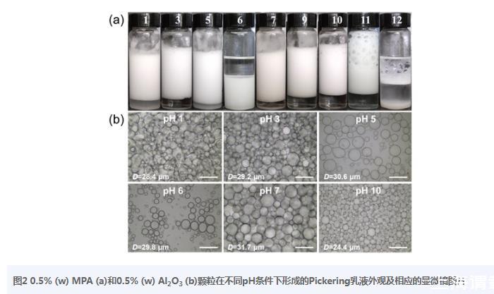 當pH=6時,親水性較強的MPA分子或Al2O3顆粒都不能形成穩定的乳液,但兩者混合后,可以形成穩定的W/O Pickering乳液,這可能是因為Al2O3顆粒被MPA分子經靜電相互作用改性后疏水性增加導致的。進一步增加pH(7<pH<11),穩定性欠佳的O/W乳液轉變為穩定的O/W Pickering乳液,樣品瓶底部澄清的水層可以說明,此pH區間內,MPA分子和納米Al2O3顆粒相互作用較強,Al2O3顆粒幾乎全部參與到穩定Pickering乳液,并且乳化層上面的泡沫層越來越高,乳液液滴的粒徑也逐漸減小。然而,當水溶液為強堿時(pH=12),無法形成穩定的乳液,這是因為部分Al2O3顆粒可以與強堿發生反應生成可水溶的偏鋁酸鈉(NaAlO2)導致的。