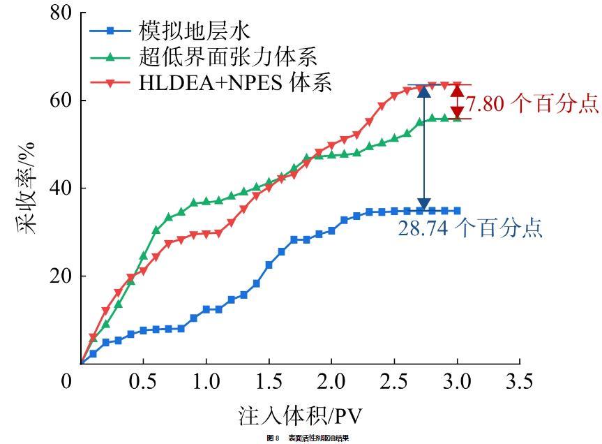3)HLDEA+NPES體系可將原油采收率提高至63.60%,在水驅(qū)基礎(chǔ)上提高了28.74個百分點,在超低界面張力體系驅(qū)基礎(chǔ)上提高了7.80個百分點。