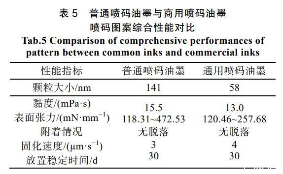 進一步對2種油墨的噴碼及圖案綜合性能對比,結果如表5所示??梢钥吹剑涸诠腆w顆粒大小以及流體黏度上,本通用油墨具有顯著優勢;在2種承印紙張上分別進行噴碼,本通用油墨具有更小及更窄的表面張力分布。隨后使用3M長膠帶對噴碼圖案表面進行反復黏接,2種噴碼油墨的圖案均無墨跡脫落,體現出優秀的附著力。最后,將圖案樣品均放置30 d,所有噴碼圖案均未出現形變、褪色和毛邊,證明具有良好的穩定性。
