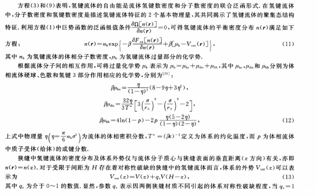 其中nb為氫鍵流體的體相分子數密度,μb為氫鍵流體過量部分的化學勢。