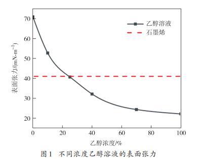 水和乙醇的表面張力分別為70.95 mN·m-1和22.17 mN·m-1,我們采用一定體積比的乙醇和水調(diào)配出與微晶石墨表面能接近的乙醇水溶液,并以此為溶劑球磨微晶石墨,研究溶劑的表面張力對(duì)球磨后微晶石墨粒徑的影響。從圖1可知,25%乙醇溶液的表面能為40.69 mN·m-1,與石墨烯的表面能(40.80 mN·m-1)相近,從圖2可知,其對(duì)應(yīng)的微晶石墨中位粒徑最小。當(dāng)溶劑的表面能與微晶石墨表面能相近時(shí),微晶石墨能更好地分散在溶劑中,從而提高球磨效率。所以在本工作中,選擇25%的乙醇水溶液作為球磨溶劑。
