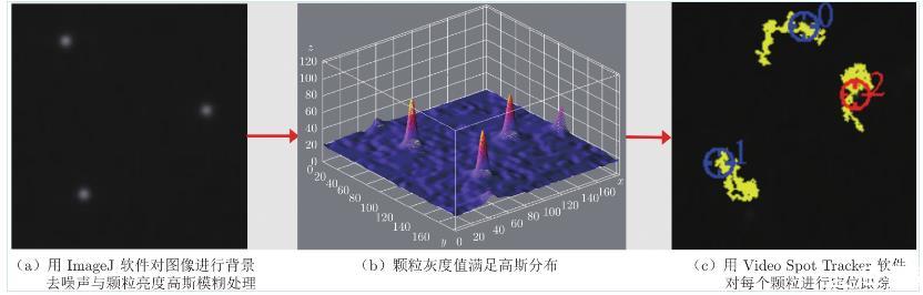 實(shí)驗(yàn)采用Olympus顯微鏡(配備60倍物鏡)觀察顆粒在膜上的布朗運(yùn)動(dòng),同時(shí)利用電子增益高速攝像機(jī)(Andor 897 EMCCD)進(jìn)行拍攝。每個(gè)視頻拍攝時(shí)間為200 s,幀頻為0.05 s,曝光時(shí)間5 ms,圖像尺寸為300像素×300像素,分辨率為0.26μm/m。采集原始圖像中的顆粒灰度值不符合標(biāo)準(zhǔn)高斯分布,因此使用圖像處理軟件ImageJ對(duì)圖像進(jìn)行背景去噪聲(Background Subtraction)和高斯模糊(Gauss-ian Blur)處理(圖3(a)),使顆粒灰度值達(dá)到標(biāo)準(zhǔn)高斯分布(圖3(b))。之后用Video Spot Tracker軟件定位每個(gè)顆粒的灰度峰值(圖3(c)),即顆粒質(zhì)心,定位誤差僅為0.5像素,進(jìn)而對(duì)顆粒二維運(yùn)動(dòng)軌跡(平面)進(jìn)行實(shí)時(shí)跟蹤。軟件自動(dòng)將顆粒在每一時(shí)刻的像素位置坐標(biāo)存入計(jì)算機(jī)中,使用MATLAB計(jì)算顆粒在不同時(shí)間間隔Δt內(nèi)沿和方向的位移,計(jì)算公式如下:
