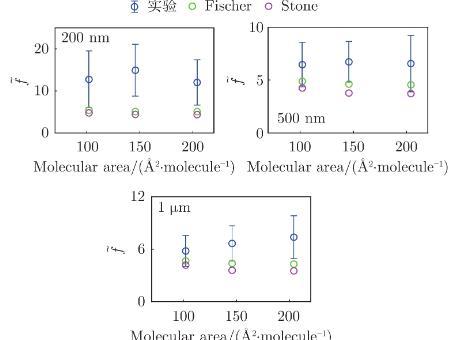 表1不同密度LE相膜上的顆粒與膜的接觸角θ、浸沒角?及顆粒暴露在氣相中的高度d為消除粒徑影響,下文將轉(zhuǎn)變?yōu)闊o量綱阻力系數(shù)為顆粒運動速度)求得。Stone解對于任意均適用。