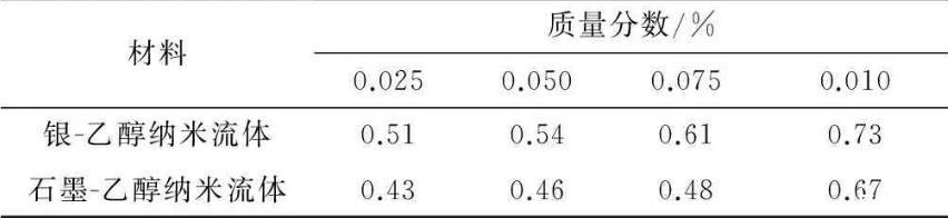 1)隨著質量分數增加到0.1%的過程中,納米流體表面張力下降了17%——25%,電導率卻升高了40%——60%.兩者的變化導致納米流體的τc/τH隨質量分數的升高呈現上升趨勢。