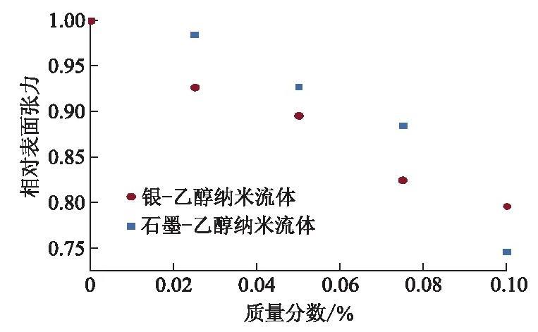 表面張力是決定τH的關鍵參數,采用重力法對不同質量分數納米流體的表面張力進行了測量。結果如圖1所示,隨著納米顆粒質量分數的增大,相對表面張力逐漸減小。納米流體中的部分石墨顆粒會漂浮于液滴表面,疏水性較好的納米顆粒,使原本光滑平整的氣液兩相界面變得粗糙,減小了流體的表面張力。當納米顆粒質量分數達到0.1%時,納米流體的表面張力減小了17%——25%.