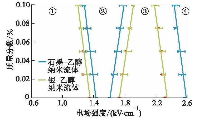 2)低流速工況下,銀~乙醇納米流體率先進入紡錘模式,由紡錘模式向錐射流模式過渡時臨界電場強度卻高于石墨~乙醇納米流體,且隨著質量分數的升高,納米流體的錐射流模式區間呈現縮趨勢。由錐射流模式向多股射流模式轉變的過程中,銀~乙醇納米流體率先進入且隨著質量分數的升高,臨界電場強度逐漸降低。