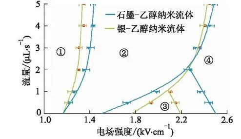 流量是影響納米流體霧化特性的另一重要參數。尋找在較大流量下依然能保持穩定霧化效果的區間,對工業應用具有十分重要的意義。質量分數為0.1%的納米流體在不同流量下霧化模式隨電壓的變化區間如圖3所示,區間①為滴狀模式,區間②為紡錘模式,區間③為錐射流模式,區間④為多股射流模式。相同電場強度下隨著流量的增加,單位體積流體荷電量也隨之減小。因此,流體從滴狀模式進入紡錘模式所需電場強度逐漸升高(圖3區間①→②)。由圖3區間②可知,隨著流量的增大紡錘模式所占區間逐漸增大。低流速(<2μL·s-1)狀態下,電場強度增大,流體表面集聚大量電荷,致使液體表面張力降低,霧化模式也就從紡錘模式逐步向錐射流模式過渡(圖3區間②→③)。納米流體的錐射流模式僅僅發生在流量低于2μL·s-1時,并且隨著流量的增大,錐射流模式所在區間迅速減小直至消失(圖3區間③)。電場對流體荷電的能力有限,流量的增加使得流體不穩定性增大,大部分電荷無法聚集至液錐表面,從而導致錐射流模式隨著流量的增大,其霧化區間迅速消失。