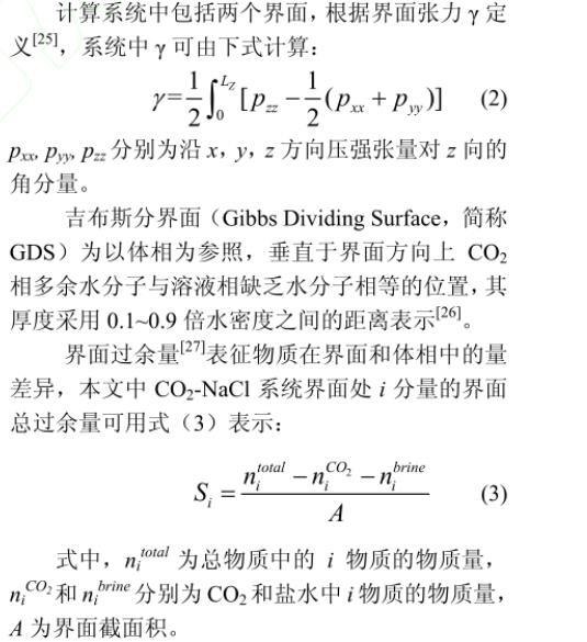 界面過余量表征物質在界面和體相中的量差異,本文中CO2-NaCl系統界面處i分量的界面總過余量可用式(3)表示