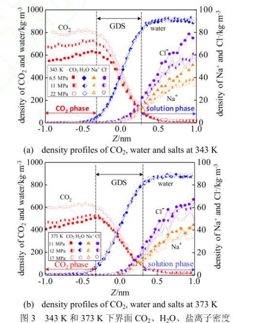 為從分子角度更加詳細地描述界面性質的變化,本文選取并計算了界面處2 nm厚度區域的CO2、H2O、Na+及Cl-的密度,結果示于圖3。由圖3可以觀測到:當從CO2相向溶液相過渡時,CO2密度逐漸下降,H2O密度則逐漸上升;而鹽離子密度則從界面中心向溶液相,由0逐漸達到某一穩定值。由圖3可以看出,溫度一定時,CO2在CO2相的密度隨著壓強的升高逐漸升高。由[圖3(a)]可以看出,溫度為343 K時,當壓強由6.5 MPa升高至22 MPa,CO2相的CO2密度從580 kg·m-3升高至800 kg·m-3左右;而溫度為373 K時[圖3(b)],當壓強由11 MPa升高至17 MPa,CO2相的CO2密度從約420 kg·m-3升高至600 kg·m-3左右。此外,對比圖3(a)和(b)還可知,當壓強恒定在11 MPa時,溫度由343 K升高到373 K,CO2相的CO2密度則由700 kg·m-3降至420 kg·m-3左右。