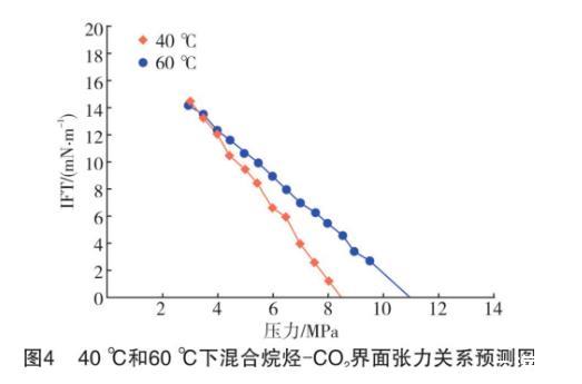 Kazemzadeh Y等的研究表明,平衡的CO2氣-油系統(tǒng)的界面張力通常隨著壓力線性降低,直到界面張力-壓力趨勢(shì)發(fā)生變化時(shí),這時(shí)的壓力稱為臨界壓力,但界面張力為零的瞬間很難捕捉到。本實(shí)驗(yàn)中,在溫度為40℃、壓力為8.5 MPa時(shí),可以觀察到滴液針管中的混合烷烴不再形成橢圓形液滴,直接和CO2發(fā)生混溶而無(wú)斷續(xù)地流入釜中,所以無(wú)法通過(guò)實(shí)驗(yàn)測(cè)量準(zhǔn)確地得到CO2和混合烷烴界面張力為0時(shí)的對(duì)應(yīng)壓力,即最小混相壓力。因此,采用外推法預(yù)測(cè)最小混相壓力。以橫軸為壓力值,縱軸為混合烷烴在被鹽水飽和的CO2環(huán)境下界面張力值的坐標(biāo)系中分別繪制40℃和60℃壓力和界面張力的散點(diǎn)圖,如圖4。從圖4可看出,隨著壓力的升高,界面張力呈線性降低的趨勢(shì)。