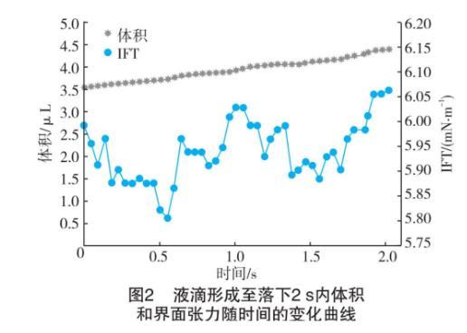 圖2為40℃、6.5 MPa時(shí),液滴形成至落下的2 s內(nèi)液滴體積和測(cè)得的界面張力隨時(shí)間的變化。由圖2可看出,在落下過(guò)程中體積逐漸變大,界面張力誤差在0.3 mN/m之內(nèi),雖然浮動(dòng)不是很大,但任取一點(diǎn)不能較好地體現(xiàn)整體。因此,選擇在懸滴完全形成開(kāi)始計(jì)算,到完全落下以幀為間隔,因?yàn)橐旱瓮耆纬蓵r(shí)可以較清晰地得到液滴的最大曲率半徑,批量計(jì)算這段時(shí)間內(nèi)的界面張力值,最后得到其平均值。為避免液滴的隨機(jī)性,在每種環(huán)境下選取3個(gè)連續(xù)滴落的液滴的平均界面張力值作為最終結(jié)果。減少了實(shí)驗(yàn)的偶然性,使得到的結(jié)果更加可信。