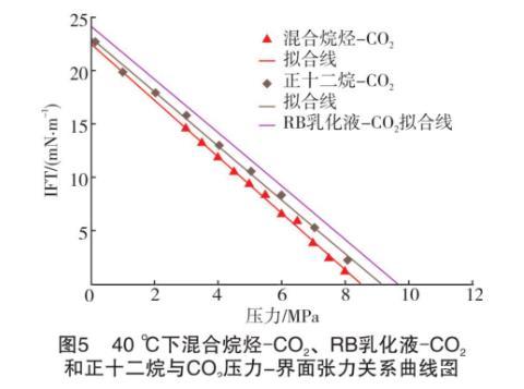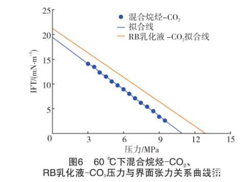 假設(shè)RB乳化液-原油不考慮斜率變化部分,始終以低壓階段(小于6 MPa)的斜率表示界面張力的變化。將表中同一溫度下不同系統(tǒng)的關(guān)系式展現(xiàn)在曲線圖上(見(jiàn)圖5和圖6)。從圖5和圖6可知,不論在哪個(gè)溫度下,混合烷烴和RB乳化液的壓力-界面張力曲線都接近平行,即兩種油的界面張力隨著壓力的升高幾乎以同樣的速度降低。計(jì)算得知,40℃和60℃下實(shí)驗(yàn)混合烷烴和RB原油的壓力-界面張力關(guān)系式中的斜率誤差為6.0%和8.6%。縱觀兩種油的組成發(fā)現(xiàn),本實(shí)驗(yàn)所使用的混合烷烴中正十二烷的摩爾分?jǐn)?shù)達(dá)71.07%,而RB原油中的C12+的摩爾分?jǐn)?shù)達(dá)到57.66%。也就是說(shuō),混合烷烴和原油的組分中占主導(dǎo)作用的是高碳數(shù)的正構(gòu)烷烴。據(jù)姬澤敏等的大量實(shí)驗(yàn)研究,界面張力在不同的正構(gòu)烷烴-CO2體系中具有極好的規(guī)律性,在相同的溫度壓力條件下,正構(gòu)烷烴的碳數(shù)和界面張力成正比關(guān)系。從文獻(xiàn)中RB原油組成分析得知,C12+的分子量高達(dá)366 g/mol,而本實(shí)驗(yàn)中的混合烷烴的分子量?jī)H為156.74 g/mol。由此得知,實(shí)驗(yàn)誤差的主要來(lái)源是高碳正構(gòu)烷烴的組成不同。