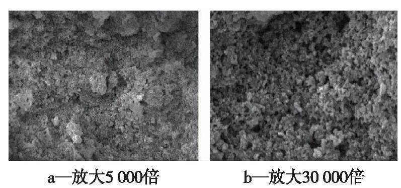 圖2a中能夠清楚地觀察到表面有1~2μm的凸起和200~300 nm的孔隙。圖2b是局部放大圖,明顯看出在涂層表面具有納米級的凹凸結構,且涂層表面分布有大量不均勻的粗糙孔結構。許多小孔分布在這些凸起之間,小凸起與小孔共同形成珊瑚狀結構,導致更多的空氣被捕獲到這些孔隙中。