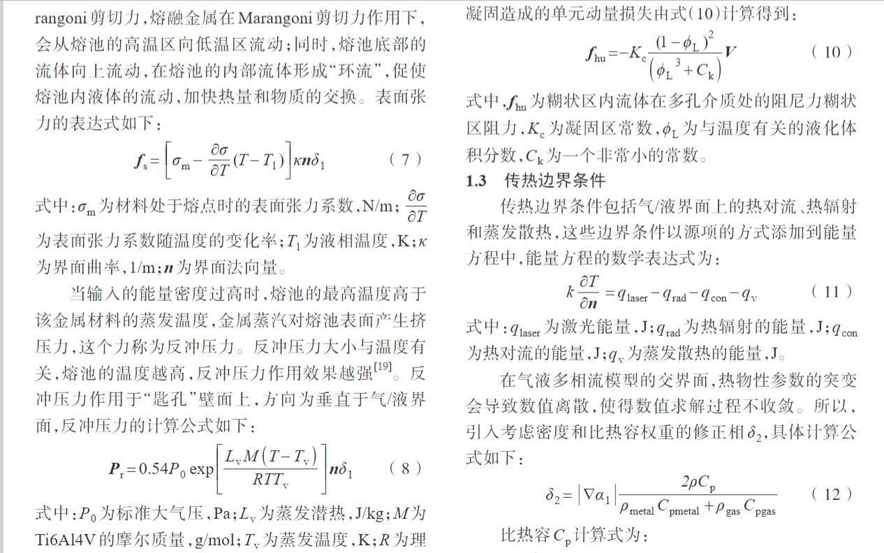 當(dāng)輸入的能量密度過高時,熔池的最高溫度高于該金屬材料的蒸發(fā)溫度,金屬蒸汽對熔池表面產(chǎn)生擠壓力,這個力稱為反沖壓力。反沖壓力大小與溫度有關(guān),熔池的溫度越高,反沖壓力作用效果越強。反沖壓力作用于“匙孔”壁面上,方向為垂直于氣/液界面,反沖壓力的計算公式如下:
