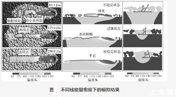 為分析線能量密度對球化缺陷形成機理的影響,選取激光功率150 W,線能量密度分別為83.3 J/m、125.0 J/m和250.0 J/m的3組參數(shù)進行數(shù)值模擬,結(jié)果如圖2所示。當(dāng)線能量密度為83.3 J/m時,部分熔融金屬凝固并與周圍粉末黏附成球;部分熔融金屬在表面張力的驅(qū)使下傾向于減少表面能,迅速地成球;這兩種成球方式往往共同出現(xiàn)。這是因為激光的穿透深度沒有到達基板,此時接觸角為180°,呈現(xiàn)不完全濕潤狀態(tài),液態(tài)金屬流動受阻,因此不能在基板上鋪展。當(dāng)線能量密度提高到125.0 J/m時,單道由球化形態(tài)向斷續(xù)態(tài)過渡,雖然表面還比較粗糙,但是球化效應(yīng)明顯減弱,此時激光穿透深度剛剛到達基板,接觸角約為90°。當(dāng)線能量密度繼續(xù)提高到250.0 J/m時,熔化的金屬粉末形成充足的熔融金屬,從而改善其流動性,凝固后獲得高度均勻和連續(xù)的單道,激光穿透深度能夠穿透粉末床并熔化基板,并且接觸角大于90°。因此,球化缺陷的形成機理可以總結(jié)為能量密度太低,熔融金屬不能在基板上鋪展。判斷是否球化最直接的依據(jù)是觀察熔池深度是否穿透粉末層厚,并熔化了基板,也可以計算熔池的接觸角是否小于90°來判斷熔池的濕潤性。此外,還可通過適當(dāng)提高線能量密度,提高熔融金屬的流動性,以獲得更均勻和連續(xù)的單道。