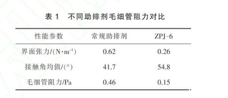 毛細(xì)管力的作用使流體流動阻力增加,導(dǎo)致壓裂后壓裂液返排困難。如果地層壓力不能克服毛細(xì)管力,壓裂液濾液和殘?jiān)皆诹芽p表面,造成儲層孔隙堵塞和壓裂液無法返排,就會致使?jié)B透率降低,傷害儲層。為了減少壓裂液在地層的停留時間,須使用助排劑,降低壓裂流體的表面張力。以降低油水相間界面張力、增大與巖心表面接觸角兩方面為目標(biāo),選取不同助排劑進(jìn)行對比(見表1),優(yōu)選出具有較佳界面張力與接觸角平衡值的新型助排劑ZPJ-6。與常規(guī)產(chǎn)品相比,新型助排劑具有較低的界面張力和較高的接觸角,毛細(xì)管阻力相對減小。