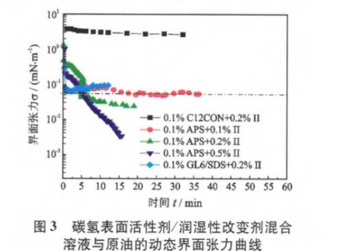 圖3碳?xì)浔砻婊钚詣?潤(rùn)濕性改變劑混合溶液與原油的動(dòng)態(tài)界面張力曲線(xiàn)
