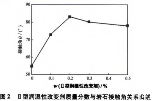 圖2為Ⅱ型潤(rùn)濕性改變劑質(zhì)量分?jǐn)?shù)與巖石的接觸角之間的關(guān)系。從圖2可以看出,隨著Ⅱ型潤(rùn)濕性改變劑質(zhì)量分?jǐn)?shù)的增加,接觸角由55°逐漸增大,當(dāng)加入0.2%Ⅱ型潤(rùn)濕性改變劑時(shí)接觸角可達(dá)到83°,繼續(xù)增加濃度接觸角略有減小,但都大于75°。