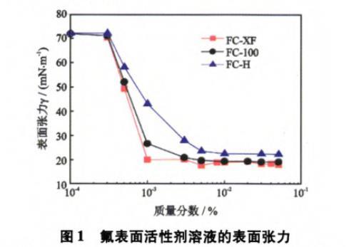 圖1為3種氟表面活性劑的表面張力曲線(xiàn)。從圖1可以看出,隨著氟表面活性劑濃度的增加,溶液表面張力迅速下降,當(dāng)濃度達(dá)到臨界膠束濃度(cmc)后,隨著濃度的增加,表面張力趨于穩(wěn)定。3種氟表面活性劑FC-XF、FC-100和FC-H水溶液的cmc分別為0.001%、0.003%和0.005%,最低表面張力γcmc分別約為19、19.5和22.5 mN/m。因此,兩性氟表面活性劑FC-XF比2種非離子型氟表面活性劑具有更強(qiáng)的降低表面張力效率(低cmc)和能力(低γcmc),而且兩性型氟表面活性劑也不存在非離子型表面活性劑在更高溫度下氧乙烯基團(tuán)失去親水性而不溶于水的問(wèn)題。因此選擇FC-XF作為助排劑中的氟表面活性劑。