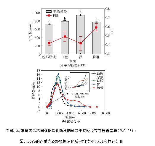 圖5 LOPs的雙重乳液經(jīng)模擬消化后平均粒徑、PDI和粒徑分布