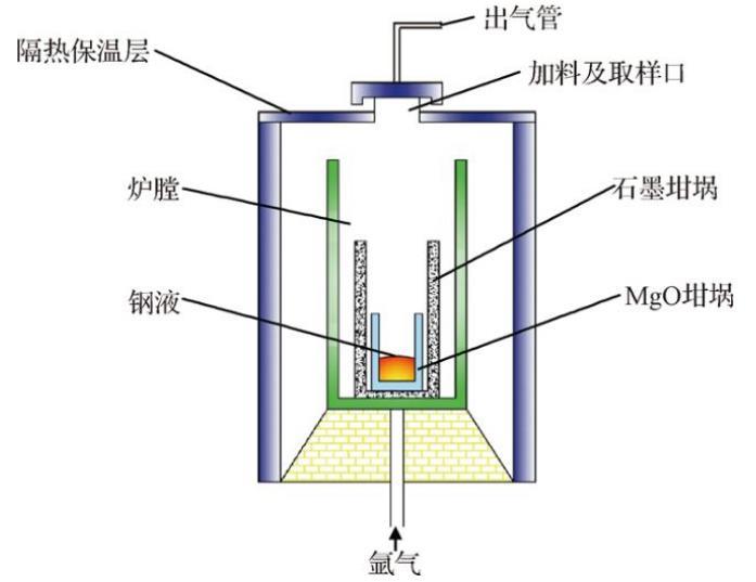 將重軌鋼鑄坯切成20 mm×15 mm×10 mm的鋼塊并打磨氧化皮,每爐試驗取約300 g鋼塊疊放在MgO質(zhì)量分數(shù)為99.5%的坩堝中,并隨石墨坩堝一同放置在管式電阻爐中,調(diào)好程序緩慢加熱升溫,試驗裝置如圖1所示。當(dāng)溫度升至600℃時,氬氣(質(zhì)量分數(shù)為99.99%)流量控制為2.5 L/min,保持坩堝內(nèi)中性氣氛,當(dāng)溫度升至900℃時,氬氣流量調(diào)整為3.5 L/min,爐膛升溫至1 600℃后持續(xù)保溫30 min以保證鋼液熔化且均勻。