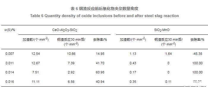分析鋼渣反應(yīng)前后夾雜物的成分可知,重軌鋼中氧化物夾雜分為SiO2-MnO系和CaO-Al2O3-SiO2系兩類夾雜,圖8所示為兩類典型夾雜二維形貌。各類氧化物夾雜在鋼渣反應(yīng)前后數(shù)量密度變化見表6。可以看出,鋼中主要夾雜為鈣鋁硅酸鹽,因此鋼渣反應(yīng)30 min后,鈣鋁酸鹽的去除率同總氧化物夾雜的去除率相近,隨著氧、硫質(zhì)量分?jǐn)?shù)的增高,鈣鋁酸鹽的去除率呈升高的趨勢。由于鋼中硅錳夾雜數(shù)量較少,且掃描面積有限,僅從以上表格統(tǒng)計(jì)的數(shù)量密度不具代表性,因此其去除率未呈現(xiàn)明顯規(guī)律。