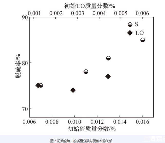 檢測每爐試樣1和試樣2的硫和全氧質(zhì)量分?jǐn)?shù),結(jié)果見表3。可以看出,固定鋼中全氧質(zhì)量分?jǐn)?shù),隨著初始硫質(zhì)量分?jǐn)?shù)的升高,鋼渣反應(yīng)30 min后,脫硫率逐漸增大,且穩(wěn)定在74%以上,終點(diǎn)硫質(zhì)量分?jǐn)?shù)可降低到0.002 6%以下;固定鋼中硫質(zhì)量分?jǐn)?shù),隨著初始全氧質(zhì)量分?jǐn)?shù)的升高,終點(diǎn)全氧質(zhì)量分?jǐn)?shù)可降低到0.001 4%以下,終點(diǎn)硫質(zhì)量分?jǐn)?shù)可降低到0.001 8%以下,皆滿足重軌鋼的成分要求。鋼中初始硫、全氧質(zhì)量分?jǐn)?shù)與脫硫率的關(guān)系如圖3所示。