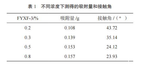 水與韓城煤粉的接觸角為73.23°。在不同濃度下測懸浮劑吸附量和接觸角,結果見表1。由表1可以看出,添加FYXF-3后,能大幅度地降低接觸角,接觸角隨著FYXF-3濃度的增大而減小,濃度大于0.5%后,減小幅度變小;吸附量隨著濃度的增大而增大,濃度大于0.5%后,增大的幅度變小。這說明FYXF-3濃度不小于0.5%時,能較大地增加吸附量、減小接觸角,從而能有效改善煤粉表面的潤濕性能,防止分散的煤粉結塊而產生沉降,這樣有利于懸浮煤粉并將其返排。
