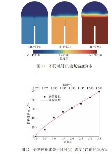 根據(jù)經(jīng)驗(yàn)公式繪制的焊縫內(nèi)釬料體積比曲線如圖12所示。經(jīng)驗(yàn)函數(shù)的釬料體積比隨時(shí)間、溫度的變化和數(shù)值模擬結(jié)果比較吻合,但在t=1~s內(nèi)的預(yù)測(cè)結(jié)果略差。