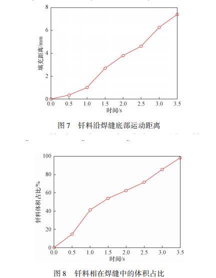 液態(tài)釬料沿著焊縫下表面的填充距離如圖7所示。前1s內(nèi),釬料未潤(rùn)濕焊縫下表面,曲線上表示為釬料豎直向下運(yùn)動(dòng)的距離,此時(shí)鋪展速度較為緩慢。當(dāng)釬料直接接觸焊縫下表面時(shí),驅(qū)動(dòng)力增強(qiáng),加速了釬料的鋪展。焊接過程中可能會(huì)出現(xiàn)微小氣泡從而影響焊接強(qiáng)度,故統(tǒng)計(jì)了焊縫內(nèi)不同時(shí)刻下釬料體積占總體積的比值(圖8)。在t=1s之前,前沿流動(dòng)速度較小,但由于填充截面面積較大,總體鋪展速度仍處于較高的水平。當(dāng)釬料開始向兩側(cè)流動(dòng),鋪展速度略微下降。最終得到的釬料填充體積占比達(dá)到98.5%,表明焊縫填充效果良好。