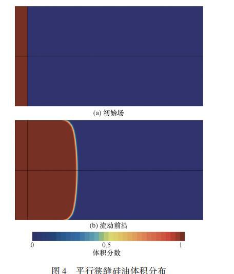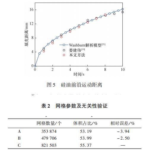 根據(jù)式(6)與式(7)可以看出,這類由表面張力驅(qū)動(dòng)的流動(dòng)與邊界處接觸角緊密相關(guān)。為保證接觸角施加方法的正確性,對(duì)表面張力驅(qū)動(dòng)下的平行平板流動(dòng)進(jìn)行了計(jì)算,并將結(jié)果與前人的數(shù)值模擬結(jié)果進(jìn)行了對(duì)比。驗(yàn)證模型為15mm×8mm×0.4mm的平行平板,所采用材料為硅油,具體物性參數(shù)如表1所示。首先將平板前端部分區(qū)域內(nèi)充滿硅油,以此為初始場(chǎng)進(jìn)行計(jì)算[圖4(a)]。圖4(b)為計(jì)算一段時(shí)間后得到的流動(dòng)前沿,最終得到的前沿最大高度隨時(shí)間變化如圖5所示,計(jì)算結(jié)果與前人數(shù)值模擬結(jié)果及Washburn解析模型吻合良好,證明了基于VOF模型的數(shù)值方法計(jì)算硅油填充平板過程的準(zhǔn)確性。