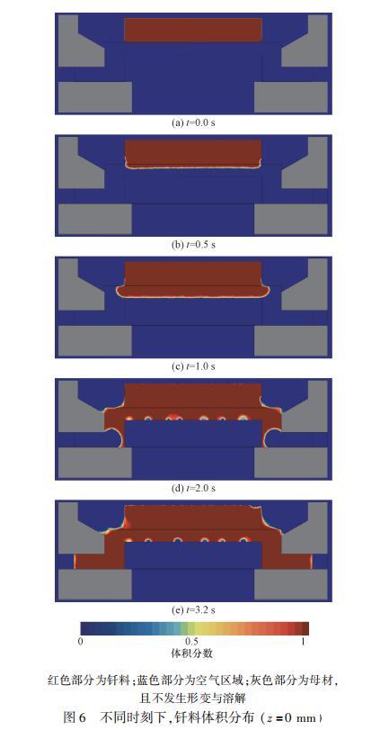 為充分評(píng)估釬料填充焊縫的流動(dòng),給出了不同時(shí)刻下x=0mm截面處的釬料體積分布(圖9),截面兩側(cè)釬料融化過程基本呈對(duì)稱分布。涂覆釬料從底部開始融化,并不斷填充焊縫,兩側(cè)慢慢形成了“凹”形液面。隨著保溫過程進(jìn)行,釬料均融化為液態(tài),液態(tài)釬料在表面張力的作用下收縮為半球形狀。