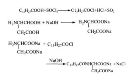 先合成十四酰氯和天冬氨酸鈉,然后再將十四酰氯與天冬氨酸鈉反應得到目標產物N-十四?;於彼徕c。