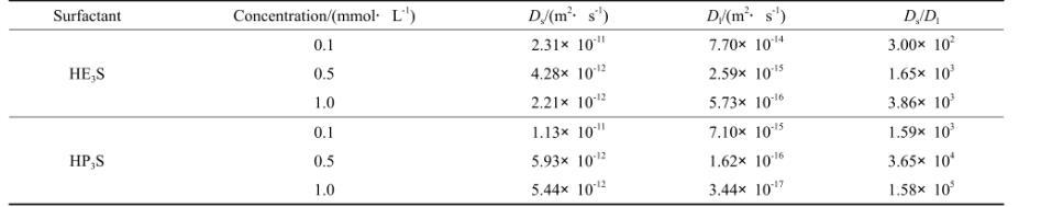 表2為根據式(2)和式(4)線性擬合并計算得到的Ds、Dl以及其相應比值。由表2可知,隨濃度的增加,Ds與Dl都變小,這是因為次表面與體相的濃度比較接近,而由于濃度的增大,會導致分子間靜電斥力作用增大,最終導致分子的自由運動受到限制。表2中Ds與Dl的比值均大于200,表明在短時吸附過程與長時吸附過程的擴散系數相差很大,即對于HE3S和HP3S低濃度水溶液的吸附過程都屬于混合動力控制吸附。