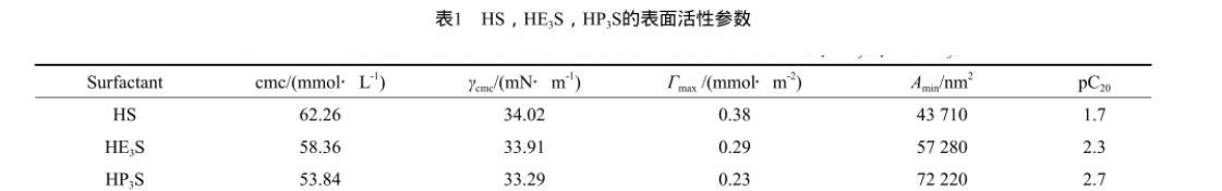 表1 HS,HE3S,HP3S的表面活性參數