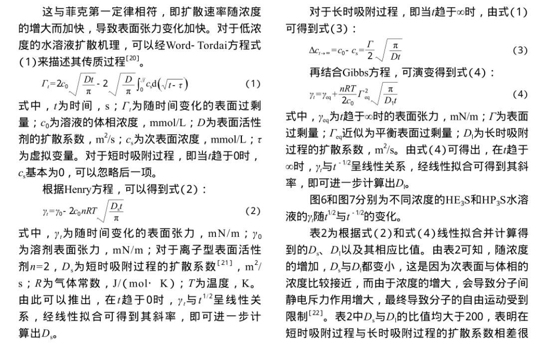 2)水溶液中的HE3S和HP3S分子可以快速擴散到氣-液界面,迅速降低表面張力并達到平衡值,對于低濃度水溶液,這兩種表面活性劑的吸附過程都屬于混合動力控制吸附。