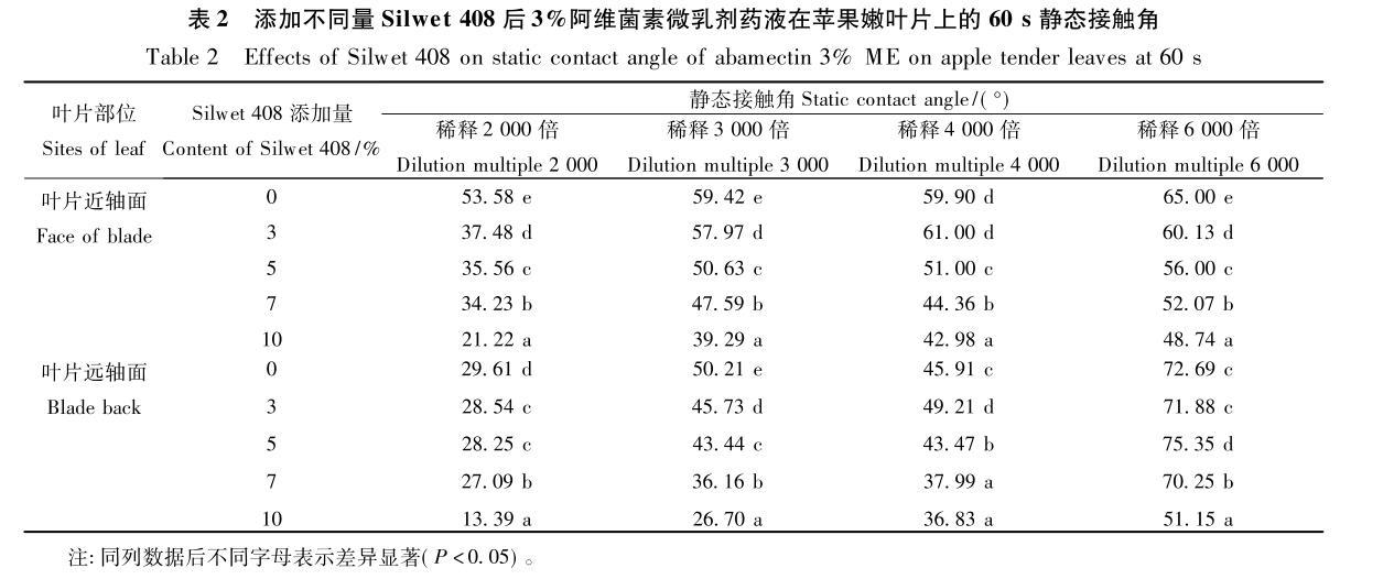 2.2添加不同量Silwet 408對阿維菌素微乳劑藥液在蘋果嫩葉片上靜態接觸角的影響