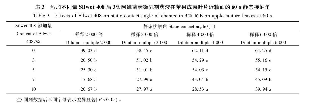 添加Silwet408可顯著改變3%阿維菌素微乳劑藥液在蘋果成熟葉片近軸面的靜態接觸角。其中,稀釋2000~4000倍時,添加Silwet408后阿維菌素微乳劑藥液在成熟葉片近軸面的靜態接觸角在17.68~55.16°之間,均顯著低于未添加Silwet408時的靜態接觸角(39.03~64.25°)(表3)。與嫩葉相比,藥液在成熟葉片上的靜態接觸角更小,說明藥液更易潤濕成熟葉片;同時,與蘋果嫩葉上的變化規律相同,隨著藥液稀釋倍數增加,其靜態接觸角呈增大趨勢。