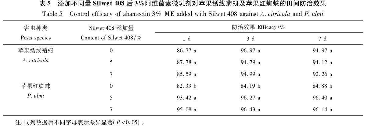 綜合表面張力、接觸角及室內毒力測定結果,選擇Silwet408添加量分別為5%和7%的阿維菌素微乳劑藥液進行了田間防效試驗。結果(表5)與室內毒力試驗結果規律基本一致:添加Silwet408對提高阿維菌素微乳劑對蘋果紅蜘蛛田間防治效果作用顯著,而對蘋果繡線菊蚜防效的影響則不明顯,再次證明Silwet408雖可有效降低阿維菌素微乳劑的表面張力和接觸角,但卻未必一定能提高其對不同害蟲的防效。