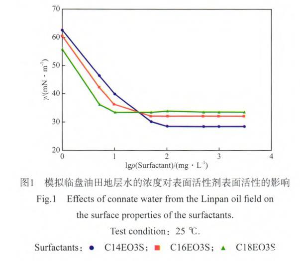 2)C14EO3S,C16EO3S,C18EO3S在蒸餾水中的cmc值分別為100,50,10 mg/L,其所對應(yīng)的γcmc分別為29.12,33.86,34.59 mN/m;在模擬臨盤油田地層水中的cmc值依次為80,40,10 mg/L,其所對應(yīng)的γcmc分別為28.86,32.38,33.75 mN/m。當(dāng)疏水基鏈長相同時(shí),隨EO數(shù)的增加,脂肪醇聚氧乙烯醚磺酸鹽表面活性劑的cmc和其所對應(yīng)的γcmc均呈增大趨勢。